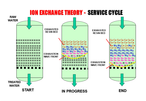 Two types of ion exchange resins are used in sequence to remove all ionic species: